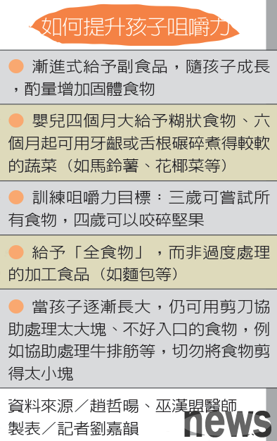 {9Zhaozheyang said that modern parents have a habit of crushing non-staple foods into mud, grinding or cutting them, which makes children lose their natural chewing ability and further affecting their physical development. There has been a long time abroad that six-month-old children can use their teeth and tongue to crush solid foods such as vegetables and roots. They must be able to eat all foods at the age of three, and because the mortar grows out at the age of four, they should be able to eat fruit foods by themselves.