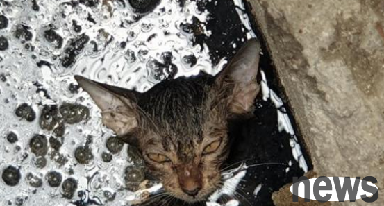A stray little cat accidentally fell into the sewer. Fortunately, the water in the sewer was not very deep. The little cat was not flooded with water, and its little head could barely extend out of the water.