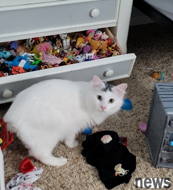 No, the cat opened the drawer and was carefully selecting his favorite toys.