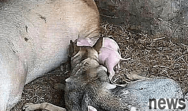The sow didn’t seem to be too repulsed by the dog’s banditry, lying aside motionless. However, the piglet seemed to dislike the big guy next to her and kept trying to squeeze it away. After all, the dog was too big and occupied many feeding positions.
