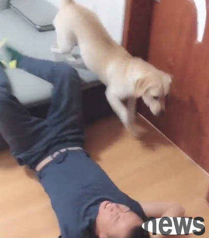 In order to build six-pack abs, the owner asked the dog to help him exercise. He asked the dog to sit on the soles of his feet and press his legs. At the beginning, they cooperated very well. When the owner saw the dog suddenly showing a sinister smile, he immediately felt that something was wrong, because the dimple in his smile was very obvious. Every time it smiled like that, it meant that it was going to do something bad. Only then did the owner realize that he had been negligent. When he wanted to get up quickly, the dog suddenly loosened its restraint on him.