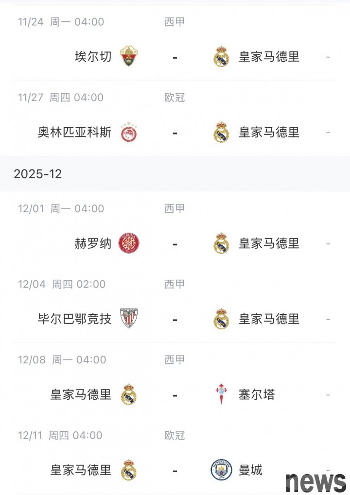 Real Madrid will have four consecutive away games after the international match day, as well as a Champions League match against Manchester City. Reporter Picon believes that this is a big test for Alonso. He wrote: "Three consecutive away journeys, including against this season's dark horses Elche and Athletic Bilbao. . And the behemoth looms in the distance: The showdown with Manchester City will be another big test to test whether this team has the ability to compete with Europe's top powers - they have failed twice this season."