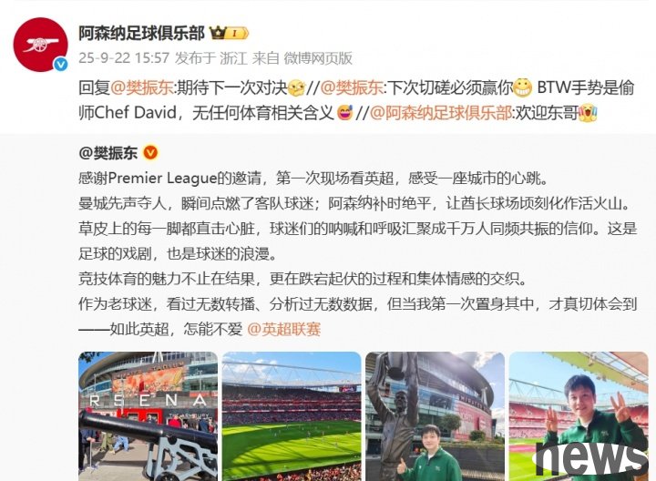 Arsenal's official Weibo also commented on Fan Zhendong and said: Welcome Brother Dong.