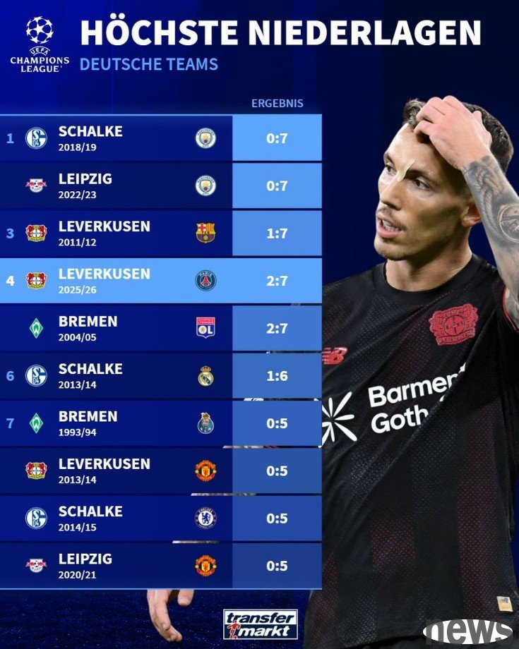 In this round of the Champions League, Leverkusen lost 2-7 to Paris. Dezhuan also took stock of the list of the biggest defeats by Bundesliga teams in the history of the Champions League, as follows: