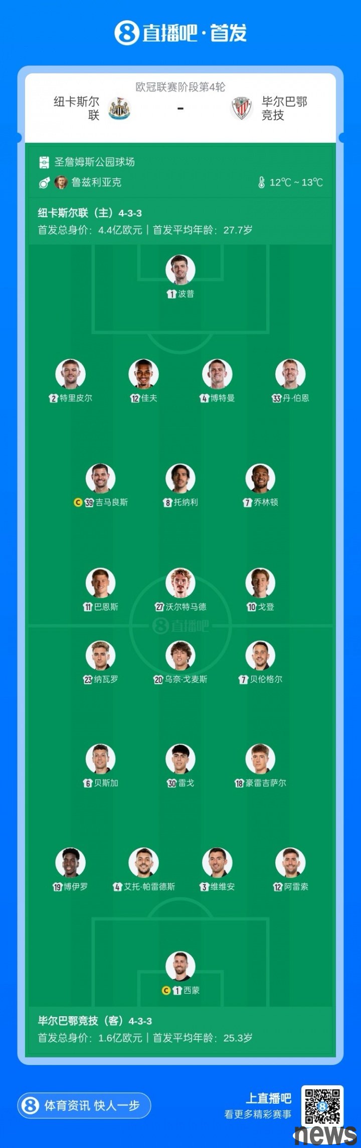 In the fourth round of the UEFA Champions League, Newcastle United faced Athletic Bilbao at home. The starting lineup was announced before the game.