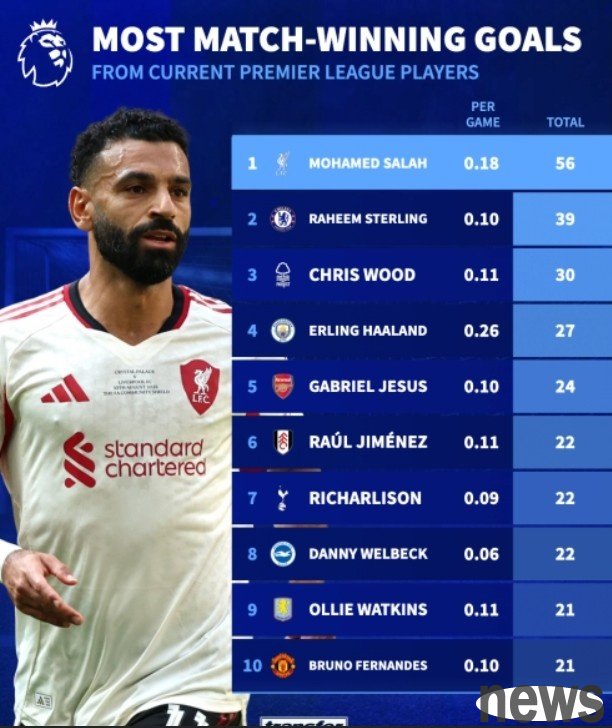 The German transfer market has taken stock of the winning goals scored by active Premier League players. Salah is far ahead with 56 goals, followed by Sterling with 39 goals.