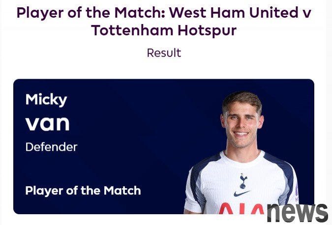 In the fourth round of the Premier League, Tottenham defeated West Ham 3-0 away. According to official Premier League news, Tottenham defender Van Devin was named the best in the game in this game, winning a total of 56% of the votes.