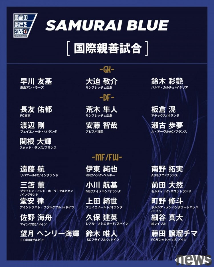 Midfield and frontcourt: Kotori Endo (Liuo Ura), Junya Ito (Genk), Takumi Minami (Monaco), Kaoru Misato (Brighton), Ogawa Yokiki (Nimegen), Maeda Daran (Celtic), Doa Ari (Frankfurt), Kise Ueda (Feyenoord), Shudo Machino (Boncheng), Kazuki Sano (Mainz), Keneyo Kubo (Real Sociedad), Masato Hoshiya (Carina Sun God), Maki Hiroshiki (Machida Zevia), Suzuki Weiren (Freiburg), Jesuzuru Kima (Sao Pauli)